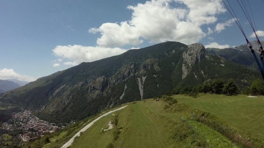 Atterrissages: dans le Lit de la Roya en sortie de village à 300m en amont de la Gare SNCF (non officiel) ou bien sur le terrain de Larmarcreuse dans la vallée de la Pia environ 200m à contrebas et en Est du décollage. Ces deux atterrissages sont particulièrement dangereux donc à éviter en pleine journée à cause de la brise très active pour le lit de la Roya ou bien à cause de fort gradient et de turbulences sur le terrain de Larmarcreuse.